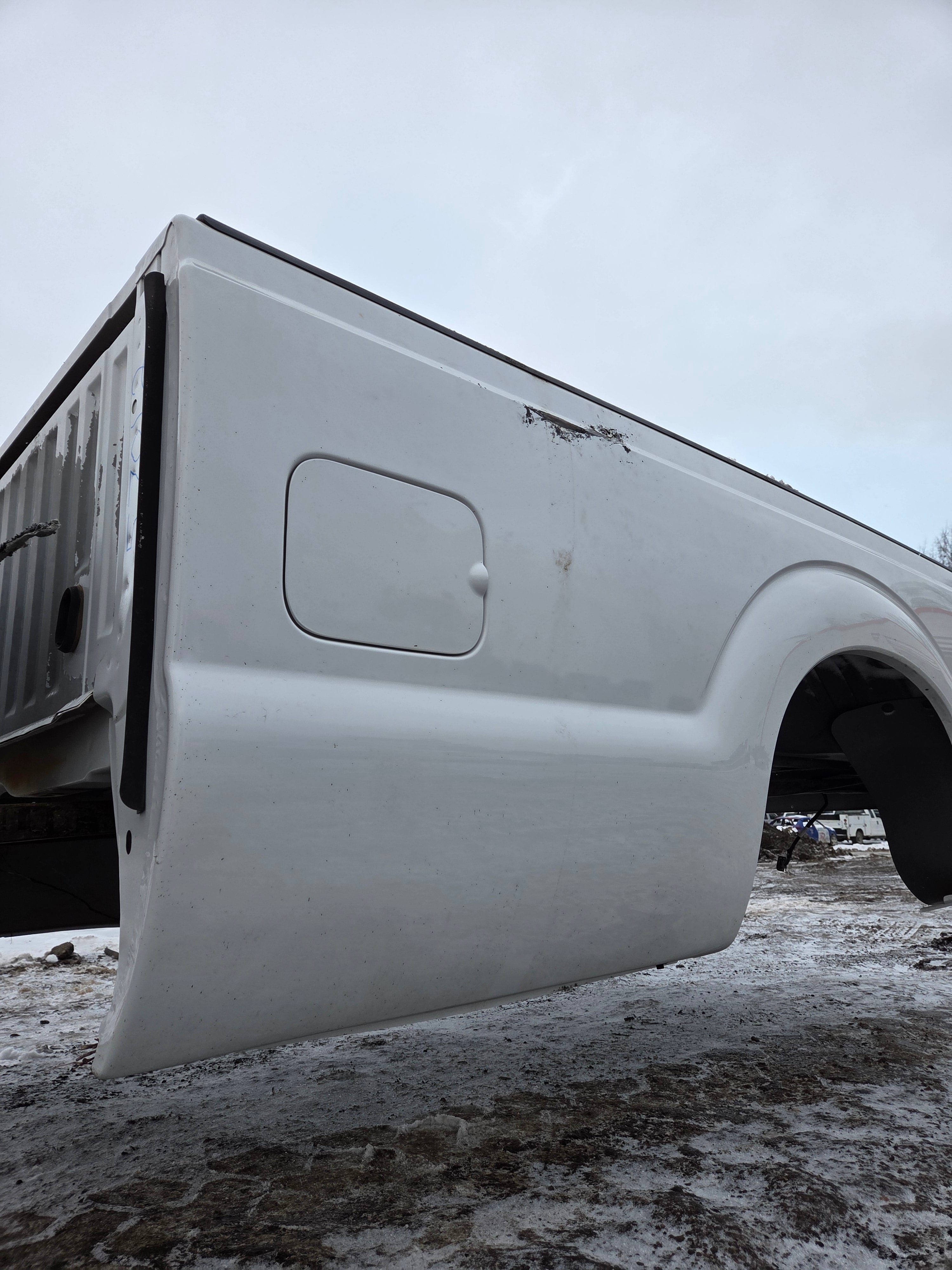 - 1999-2010 Ford F250 F350 Super Duty's with 8' bed, only difference is cosmetically, the flare around the wheel well is rolled slightly different and the fuel door is rectangular on this bed versus round on the 99-10 beds the filler neck still lines up, otherwise they are basically identical between models. The older style tailgate will work on the newer style bed if you swap the driver side hinge (only 2 bolts to swap the hinge, we swap these on the regular). All of the other body lines on the newer style beds match up with the cab of the older trucks perfectly.