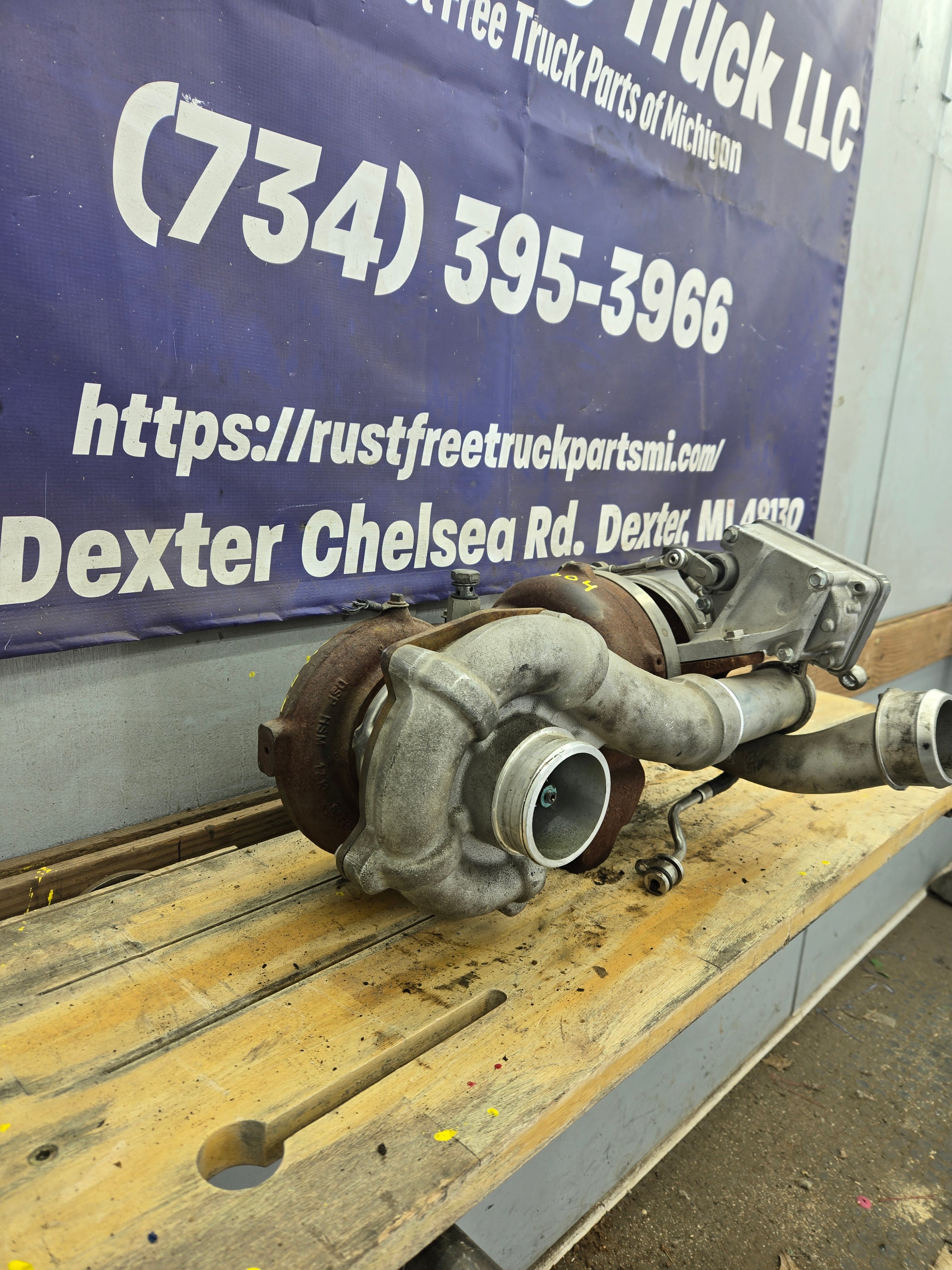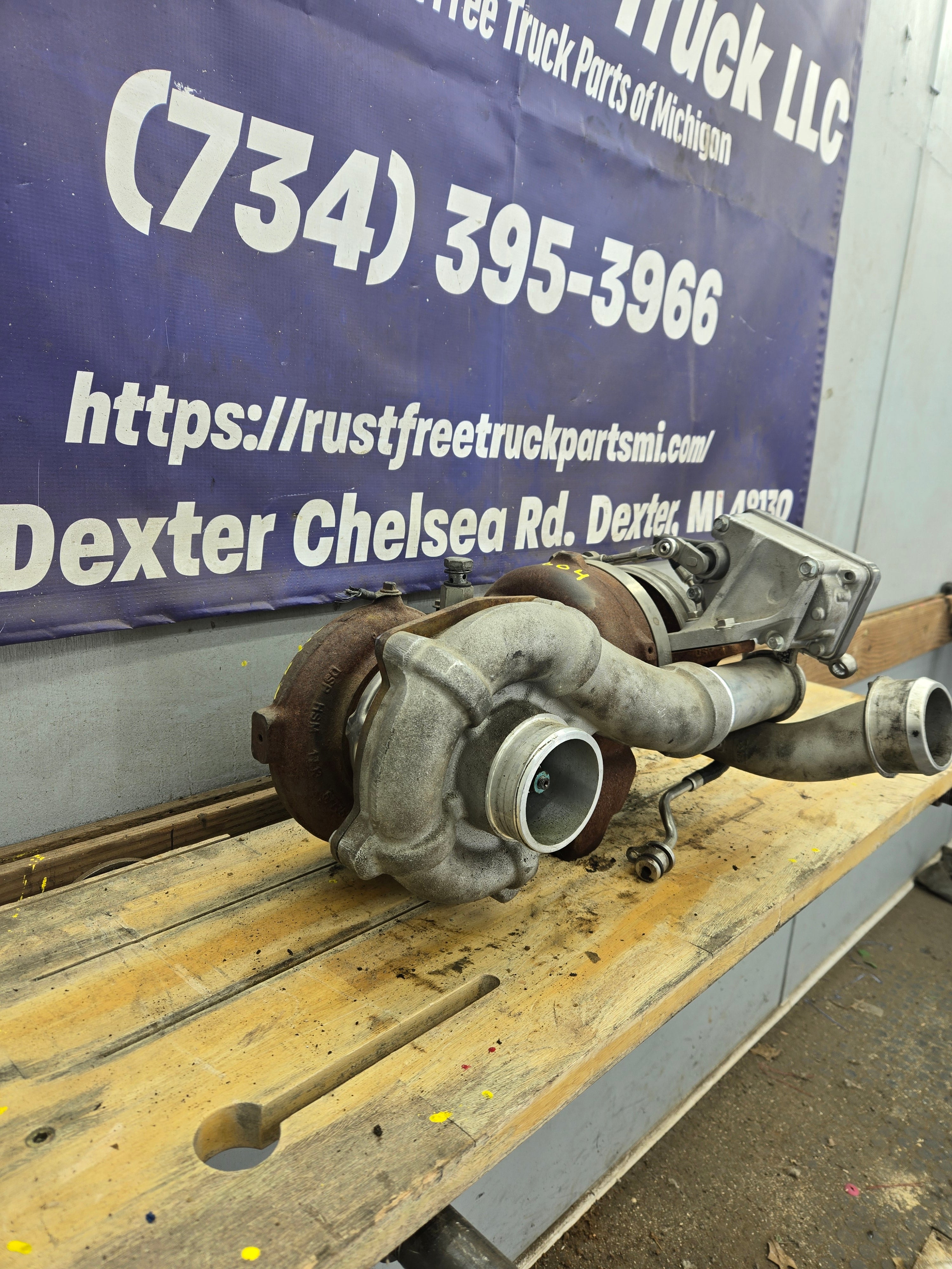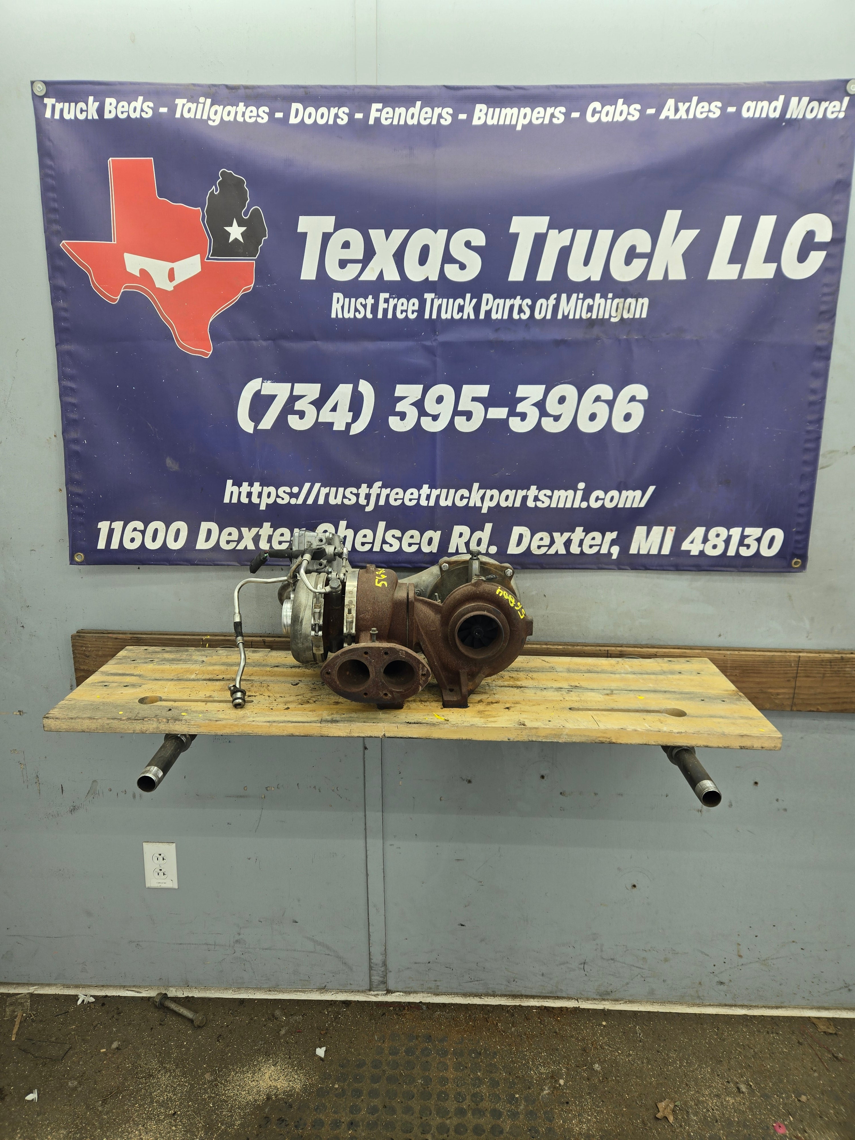 Used factory compound/twin turbos for 2008-2010 Ford Super Duty's equipped with the 6.4L Power Stroke diesel.