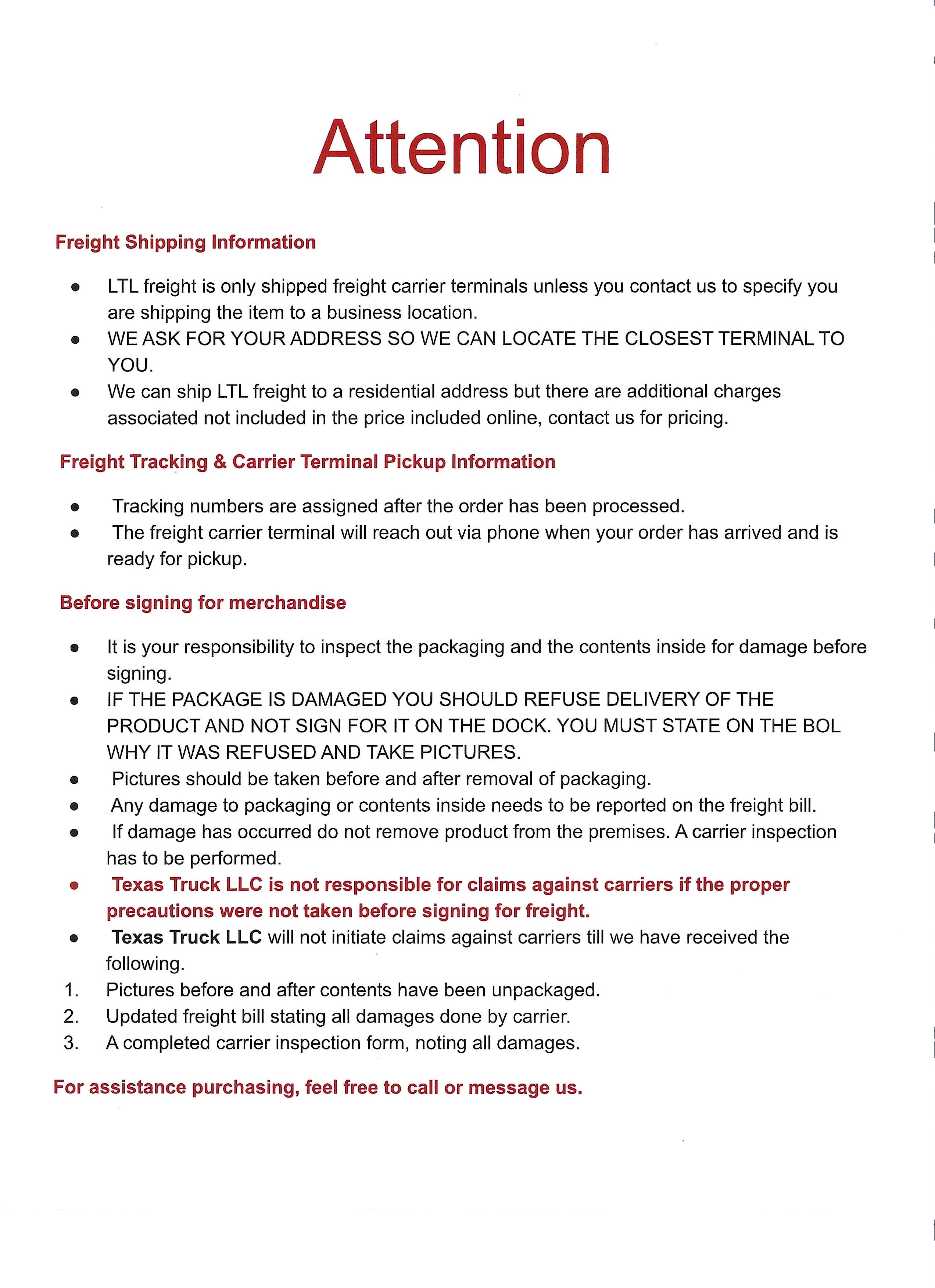 - Texas Truck LLC is not responsible for claims against carriers if the proper precautions were not taken before signing for freight.